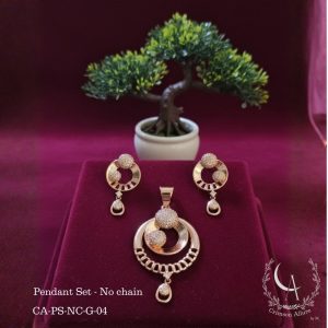 This handcrafted jewelry set features a graceful teardrop silhouette with a delicate fan-inspired pattern in a rose gold finish. Adorned with soft pastel/emerald-toned stones and subtle drop accents, the design blends elegance with modern charm, making it perfect for both everyday wear and special occasions.